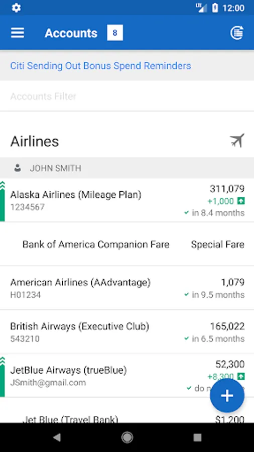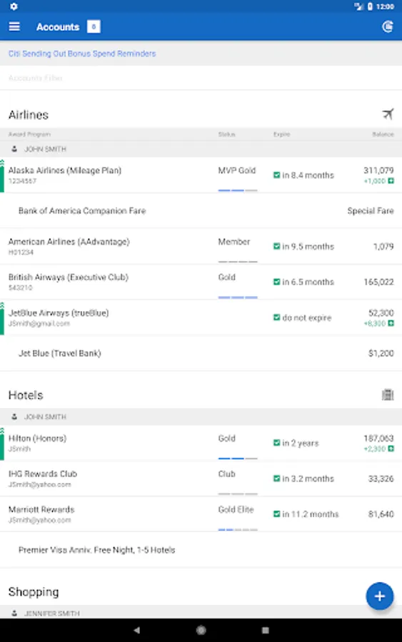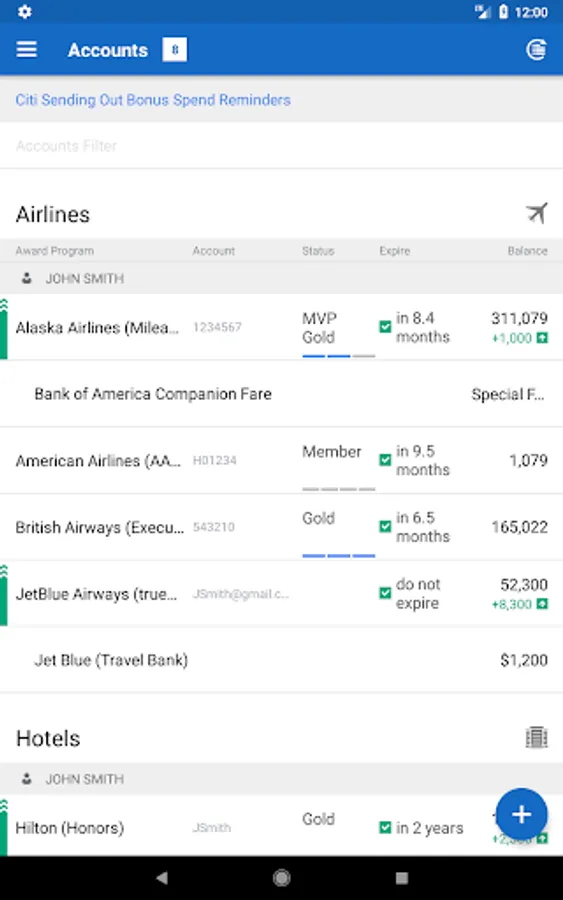 AwardWallet can track almost any type of loyalty points, such as frequent flier miles, hotel points, or credit card points. Load up all of your loyalty accounts and let AwardWallet track all of them for you. In addition to tracking points and miles (and account expirations) AwardWallet also has the following amazing features: