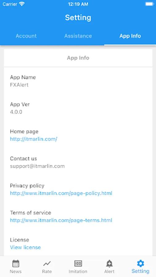 App Info, Account, Currency, Assistance