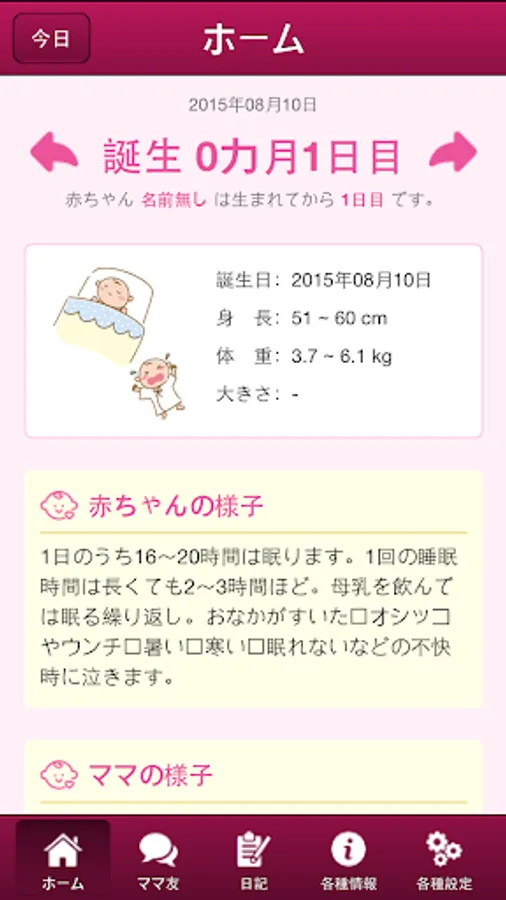 For mom during pregnancy, pregnancy days, appearance of the baby, how the mom, that you want to take care, We offer a variety of information such as the advice of senior mom. For parenting mom, baby photos, height, and then you can record every day, such as body weight, daily changes can be found in the graph. By using the functions, such as birth and between the region with each other, simple to mom friend making, you can get along with everyone. Daily, diary and health status will be recorded.