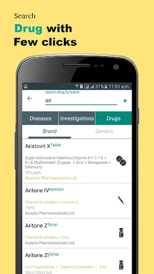 3. View option of different Brands of the generic name and the details of drugs in the treatment section
