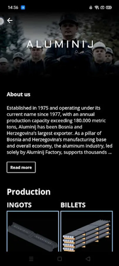 The application contains modules for news, team members' profile overviews, settings, and information about the company. The mobile app includes an external link for the visitors in the Aluminij Industries Mostar. Visitors will be able to read News About Aluminij Industries Company.