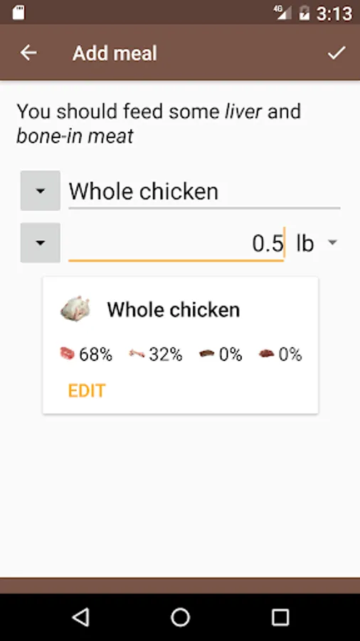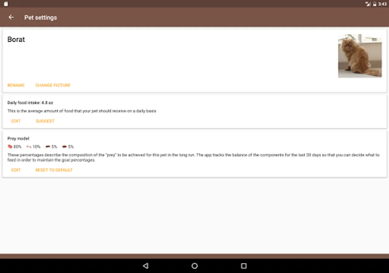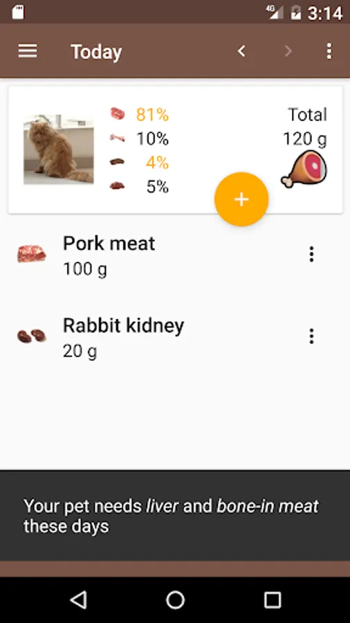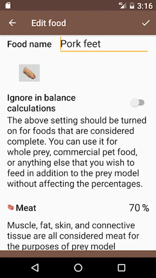 Essentially, the app is a food logger. It will simplify balancing your pet's diet by tracking the percentages and recommending what you should feed in order to get them where they should be. Thus, you can skip making complicated feeding plans. You can feed whatever you have available in the fridge now and balance it out another day. The app will help you achieve balance over the course of a customizable period of time. It will also automatically suggest a smaller meal size for the day if you have overfed recently, and a larger one if you have underfed. The goal percentages and the average daily intake can be customized for each individual pet. For example, you may wish to decrease the bone percentage for your cat, as many raw feeders do, but keep your dog to the default 10%. Although the most popular raw foods are predefined in the app, you are free to edit them or add new ones.
