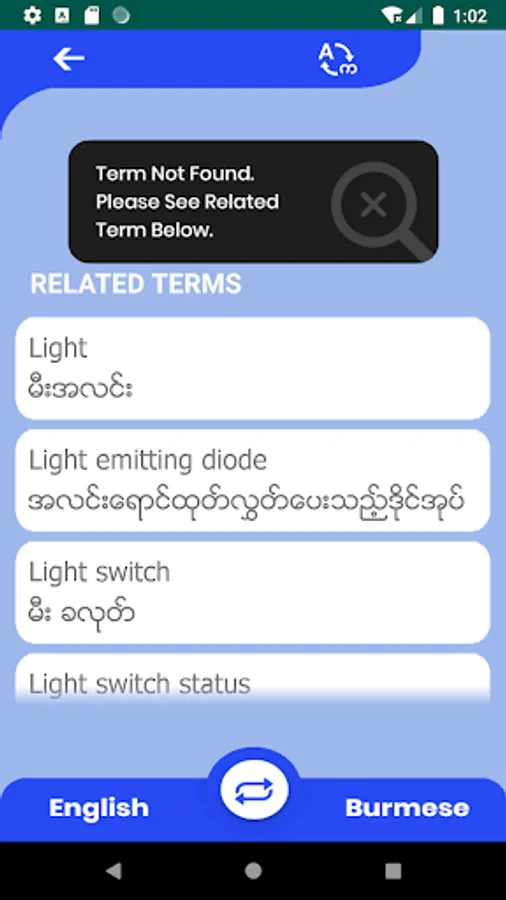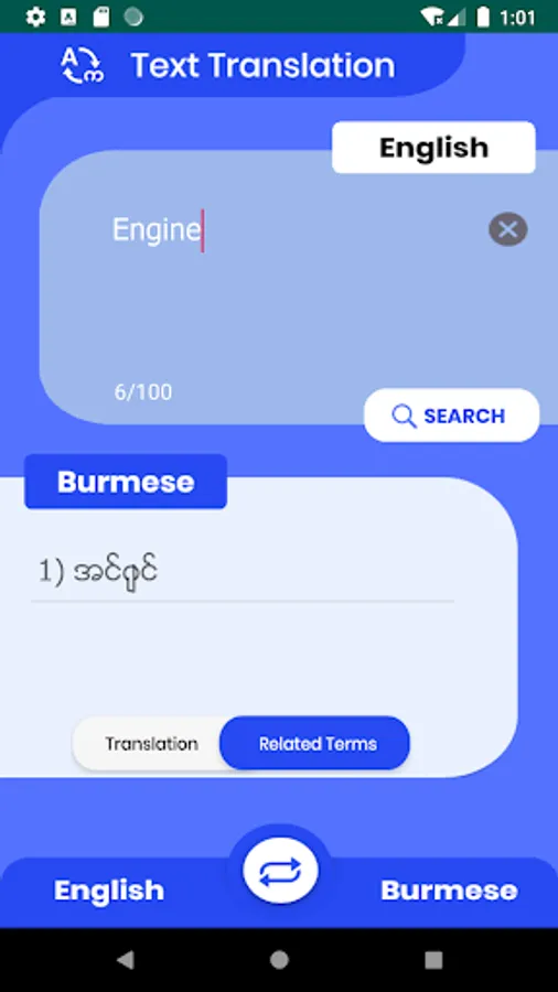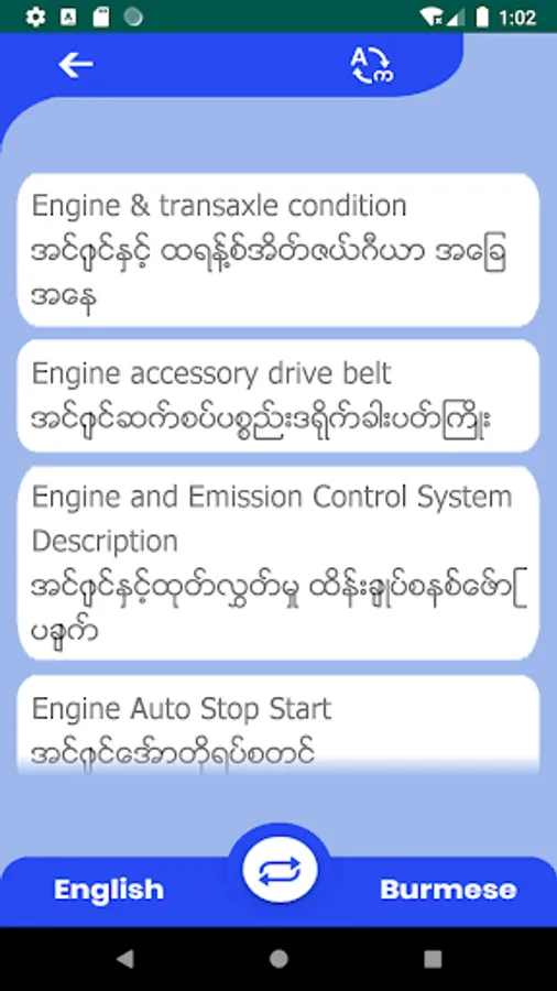 This dictionary application provides translations of automobile technical terms for both Thai to Burmese and Burmese to Thai inputs.