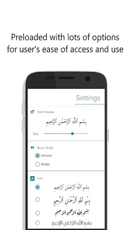 Itqan has a highly selected list of fonts compiled into its platform, with option to change text size of the Ayah.