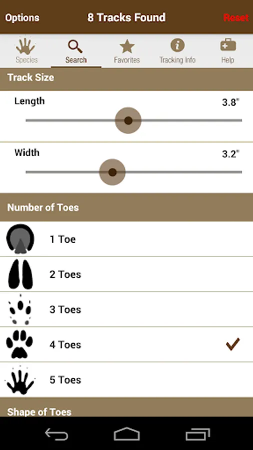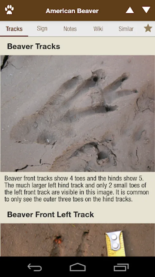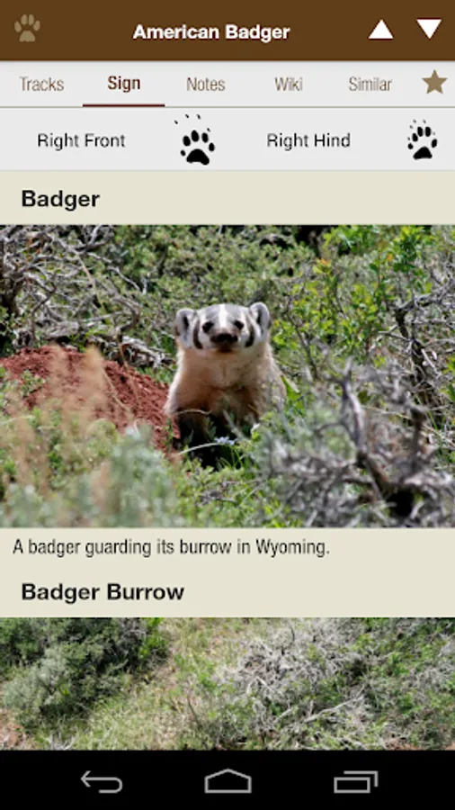 iTrack Wildlife goes far beyond what a traditional field guide can offer with powerful search tools that make track identification easier than ever before. Simply select basic characteristics of a track you want to identify and you will quickly narrow down your search to just a few similar tracks. Then, browse through the photos until you find your track.