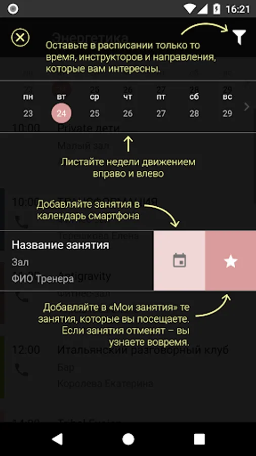 With the app you can monitor your account, news, club schedule, book a place in the classroom, paid employment, to shop in the club shop, to receive information about changes in the schedule and special offers.