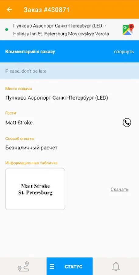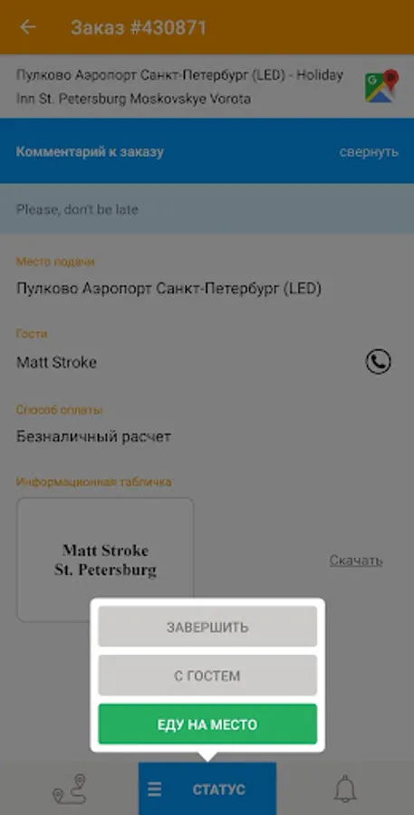 - find out the route and details of the order (guest data, route, flight number, sign for a meeting)