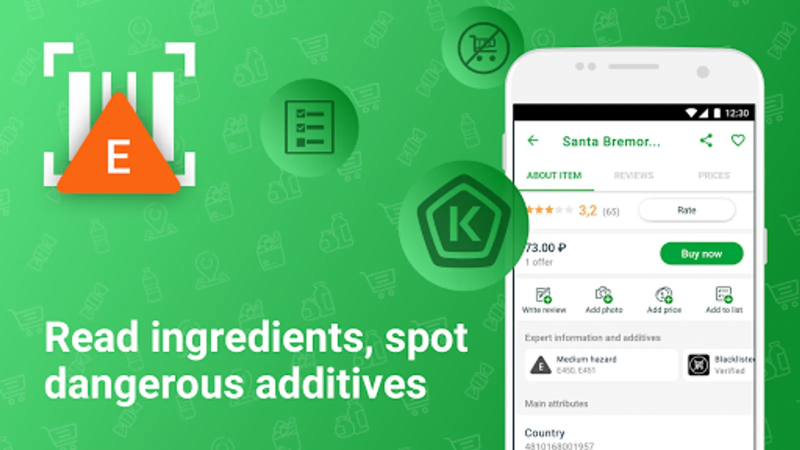 Point the camera at a barcode or Data Matrix and the application will show reviews, composition, harmful E-additives, manufacturer, average price in stores, rating and feedback from community members. You will see if the product is on the Roskontrol blacklist, and what is its rating of Roskachestvo. Scan the barcode or Data Matrix and choose only the best products for proper nutrition at the best price, in our database there are more than 30 million of them - food, alcohol, cosmetics, household chemicals and dozens of other categories. Maintain your nutrition by knowing the information through the barcode scanner!