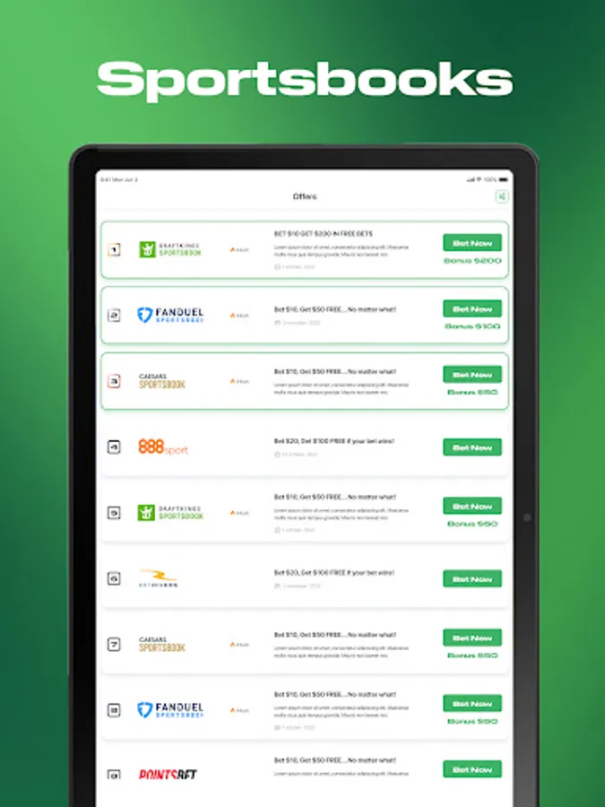 Discover Sportsbooks and offers within the “It’s a Bet” sports betting app. We list all sportsbooks that will satisfy your needs for some betting action on live in-game wagering, futures, numerous prop bets, and more! See the bonus and description for each sportsbook that offers NFL, NBA, MLS, MLB or NHL betting and sports betting in general.