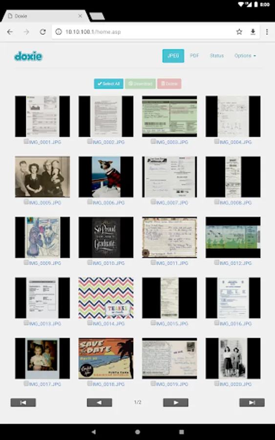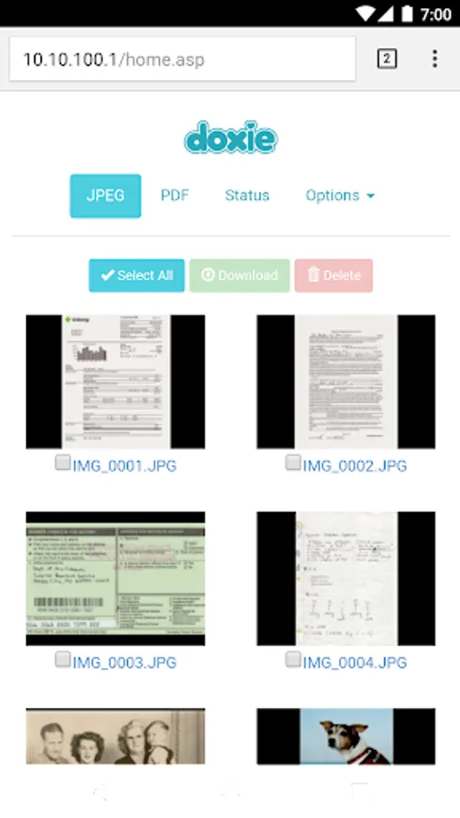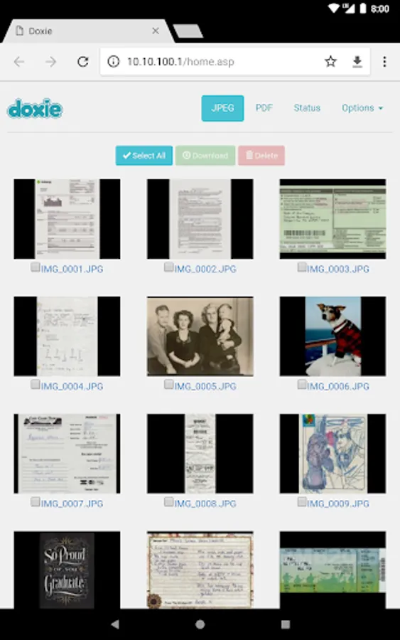 Doxie Viewer for Android makes accessing your Wi-Fi equipped Doxie scanner easy from any Android device. Just join the same network as your Doxie – either Doxie's directly created network or your local network, if you've joined Doxie to your local network – then open the app for easy access to Doxie's web-based interface for accessing your scans on the go.