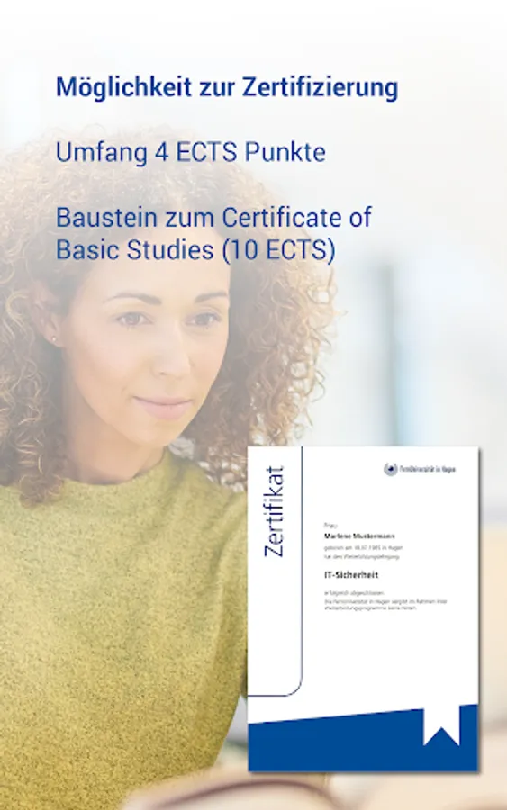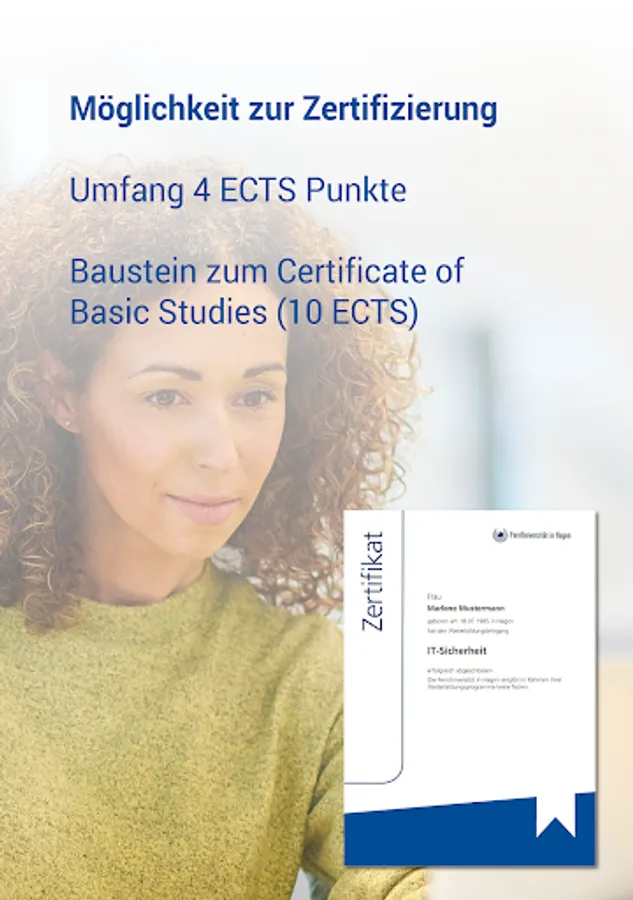 The written exam can be taken online or at a campus location of the FernUniversität Hagen of your choice. If you pass the exam, you will receive a university certificate. Students can also have the ECTS points they have earned certified for a Certificate of Basic Studies.