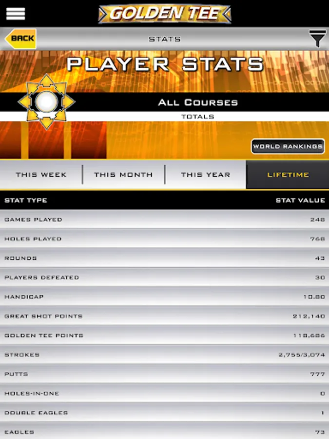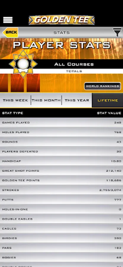 • In-depth stat-tracking: Want to see how you’ve played this week? This month? This year? Or perhaps you’re interested in some all-time numbers, averages and bests. Access your Golden Tee Web Account and enjoy stat overload!