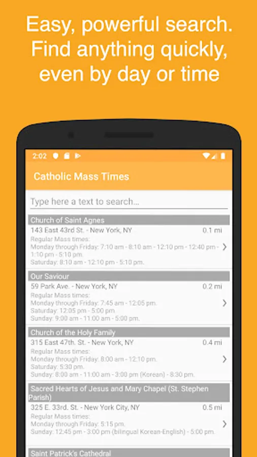 You can also see a list of the nearby churches ordered by distance and search for any text included in the church name, address, city, or mass schedule. For example, you can search for 18: to get a list of all nearby churches with masses starting between 18:00 and 18:59 hs. (Have in mind that we use the 24 hs time format in some countries and 12 hs am/pm format in others, depending on the local practice).