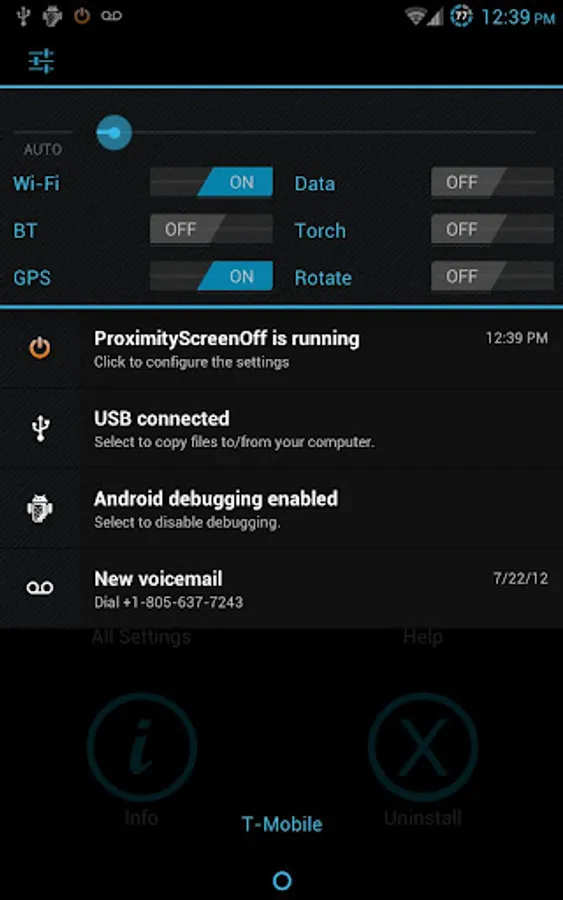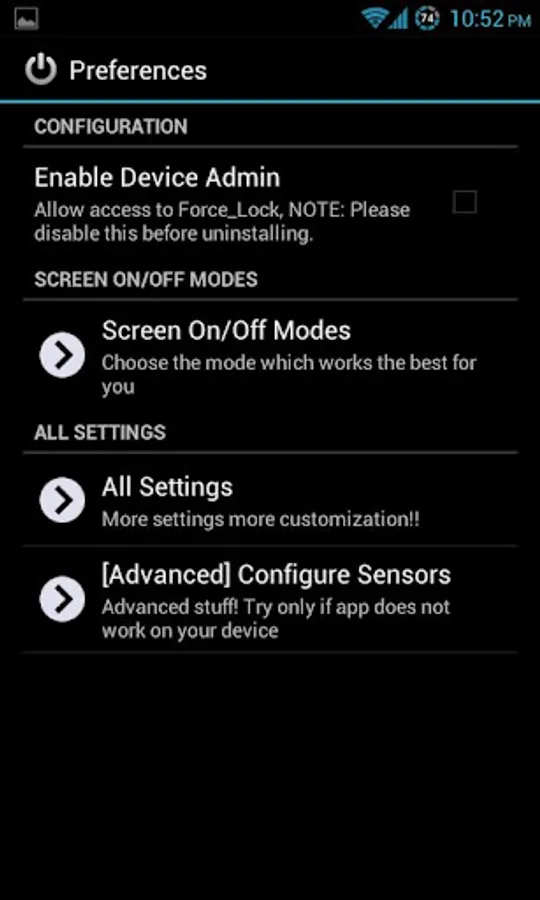 • To un-install, go Settings, Locations & Security, Select Device Administrators and disable the ScreenOff App