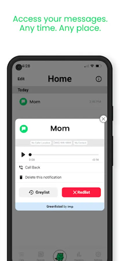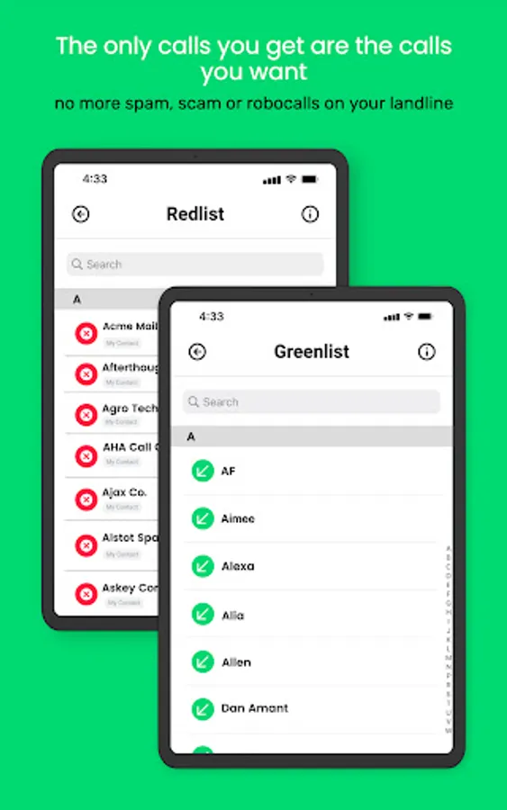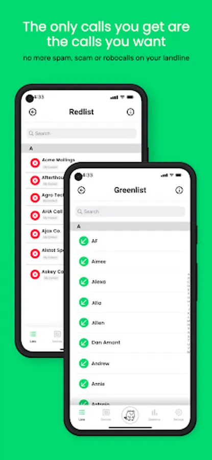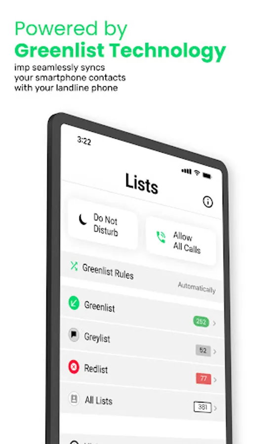 At setup, imp syncs your smartphone contacts with your landline phone. From here, using our patent pending Greenlist Technology™, imp works with you to assign callers to 1 of 3 lists: