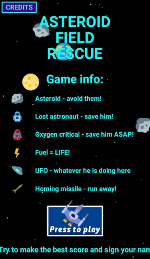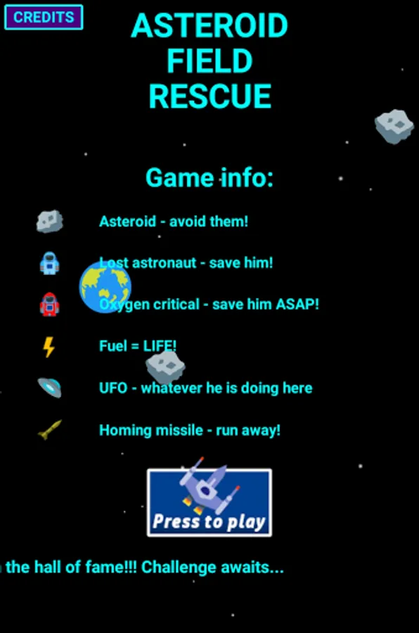 Pilot your spaceship as you go deeper and deeper into the asteroid field and save the astronauts stranded in space after their spaceship crashed. Save them ASAP before they run out of oxygen! The clock is ticking and their life depends on you! Do you think you have what it takes to save them?