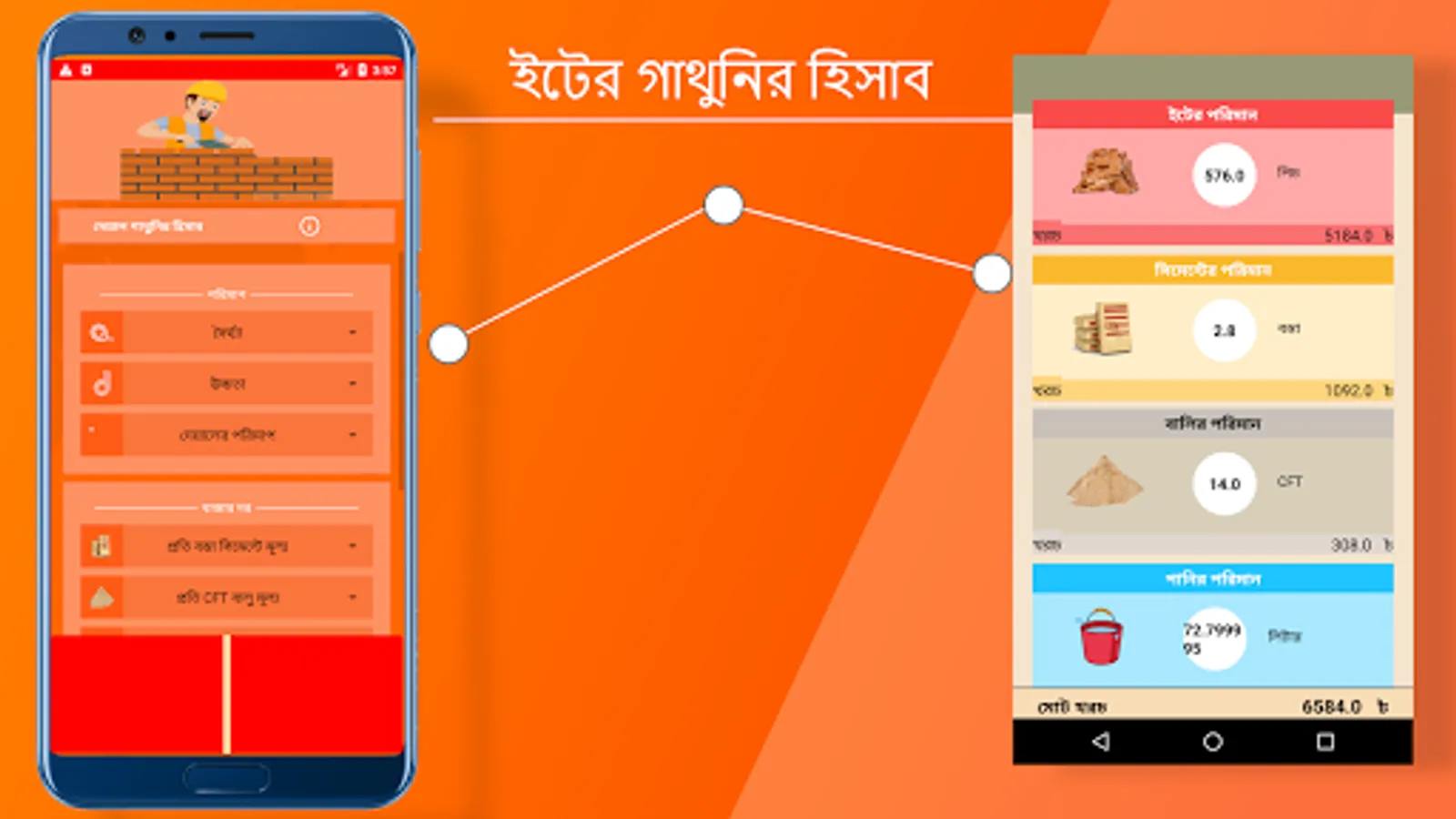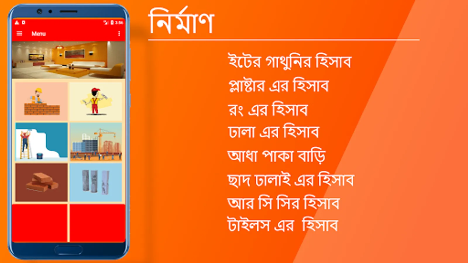 Phonetic Bangla: Ei app ti diye khub sohoje apnar building project, dalan kotha, wall, deowal, chad, jolchad, jalchad, slave, ittadir khoroc soho material er pirimap kore bite paren, eti sundor ekti building survey app, ki poriman brick, cement, khoya, loha ba iron ba Rod er hisab korte parben. dewal ba building nirman korte nijer porikolpona mote hisab nikash jorip onusare khorochapatir budget buje nin.