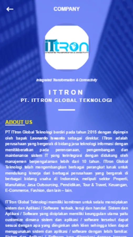 PT ITtron Global Teknologi berdiri pada tahun 2015 dengan dipimpin oleh bapak Leonardo Iswanto sebagai direktur. ITtron adalah perusahaan yang bergerak di bidang jasa teknologi informasi dengan menitikberatkan pada perencanaan, pengembangan dan maintenance sistem IT yang terintegrasi dengan didukung oleh manajemen berpengalaman lebih dari 10 tahun. ITtron Global Teknologi telah mengembangkan berbagai perangkat lunak untuk mendukung kinerja dari berbagai perusahaan yang bergerak di berbagai bidang usaha di Indonesia, meliputi sektor Properti, Manufaktur, Jasa Outsourcing, Pendidikan, Tour & Travel, Keuangan, E-Commerce, Fashion, dan lain – lain.