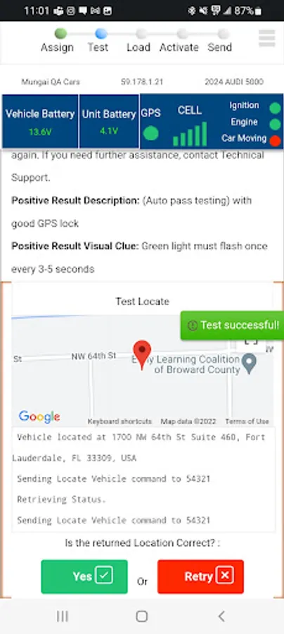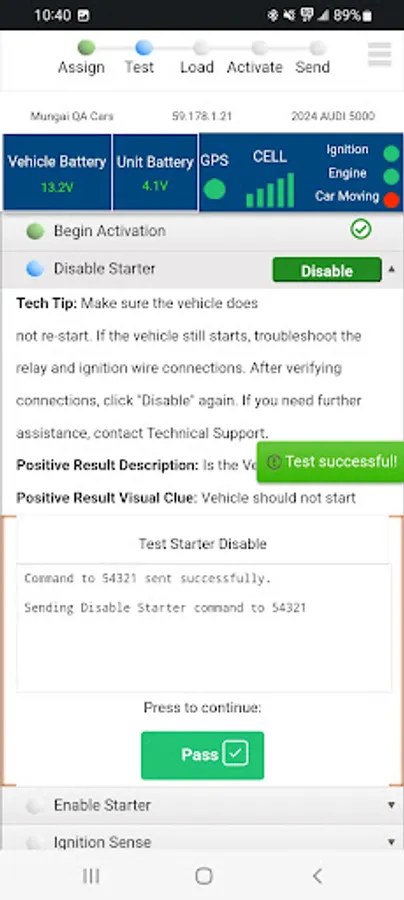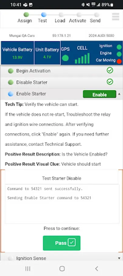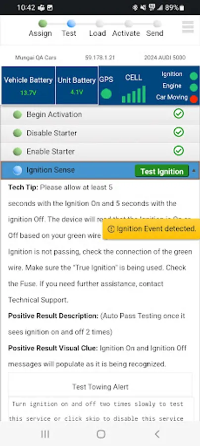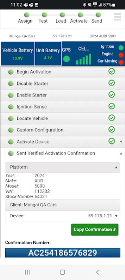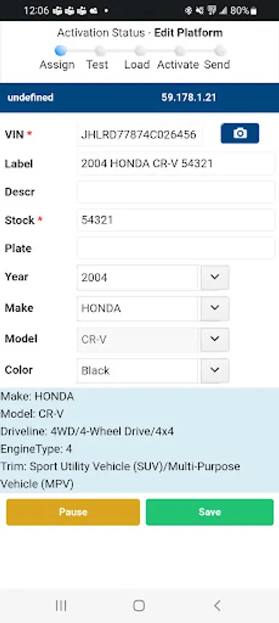 Authorized users can login, select a unit from purchased inventory on the account (either by typing in the IP address or scanning the barcode of the IP), enter vehicle information (either by typing in VIN, year, make and model, or by scanning the VIN barcode on the door of the vehicle to populate those fields) for that unit, then test the features of the product and activate it in the account to see on the web based software.