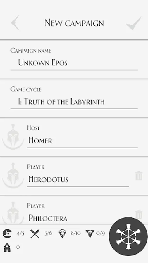 This application allows you to track and manage the main aspects of the game, indicated below: