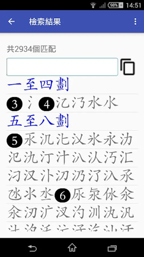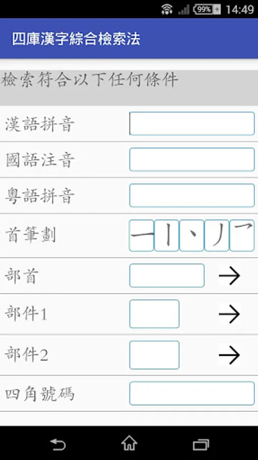 - 檢索方便,具備漢語拼音(直接輸入聲母、韻母及聲調)、粵語拼音、國語注音、首筆畫(分為「一」、「丨」、「丶」、「丿」、「乛」,只可選擇一項)、總筆畫數(可利用「+/-」擴大範圍來幫助檢索)、部首、部件(分為「上下」及「左右」兩種結構,用戶可按照所查詢文字的部件位置而選擇「上」、「下」、「左」、「右」,以收窄檢索的範圍)及四角號碼(依序取字的左上、右上、左下、右下角的筆劃,取得四位數字,再增加一位補碼,稱為「附角」,故只需輸入五個位的數字,便可查出相關文字)等多種輸入法。