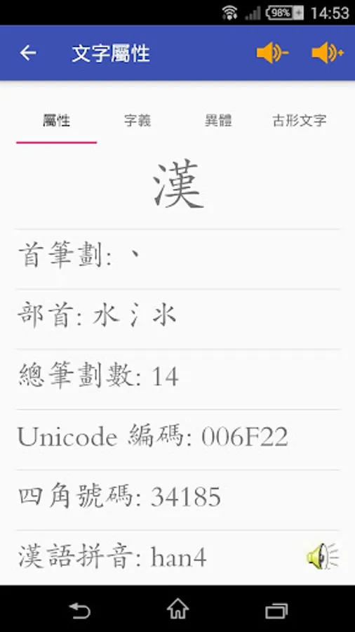 《四庫全漢字字典》(簡稱《四庫字典》)是一套檢字容易、方便實用的多功能隨身發聲漢語字典。具備部首、拼音、注音、筆畫、部件、四角號碼等多種形式的綜合中文輸入法,如同時使用便可輕易找到艱澀古字、生僻字、難字。