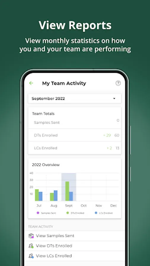 • New! View how you and your team are performing with the updated reporting feature. You can now track how many samples your team members have sent, as well as how many DTs and LCs they have enrolled. In the new reporting feature, you can now filter and compare you and your team’s progress from month to month.