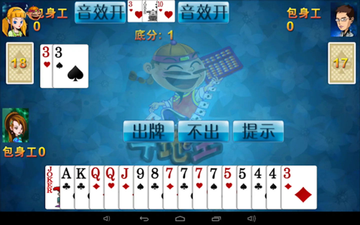 Landlords is a stand-alone screen fine, brilliant special effects, operating refreshing Landlords chess competitive games and has beautiful interface, dynamic music, a simple operation for Landlords players a smooth and rhythmic feel of the game. And also AI has a strong and intelligent prompts. PCs with high intelligence, gives players a strong opponent.