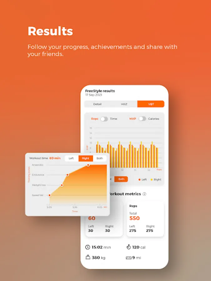 • Every rep of every set is analyzed in depth to assess if the user is staying in one of 4 velocity zones (Aerobic, Endurance, Strength, Build) and 5 heart rate zone (Warm Up, Calorie Burn, Endurance, Cardio, All Out) depending on the users desired workout optimization goal.