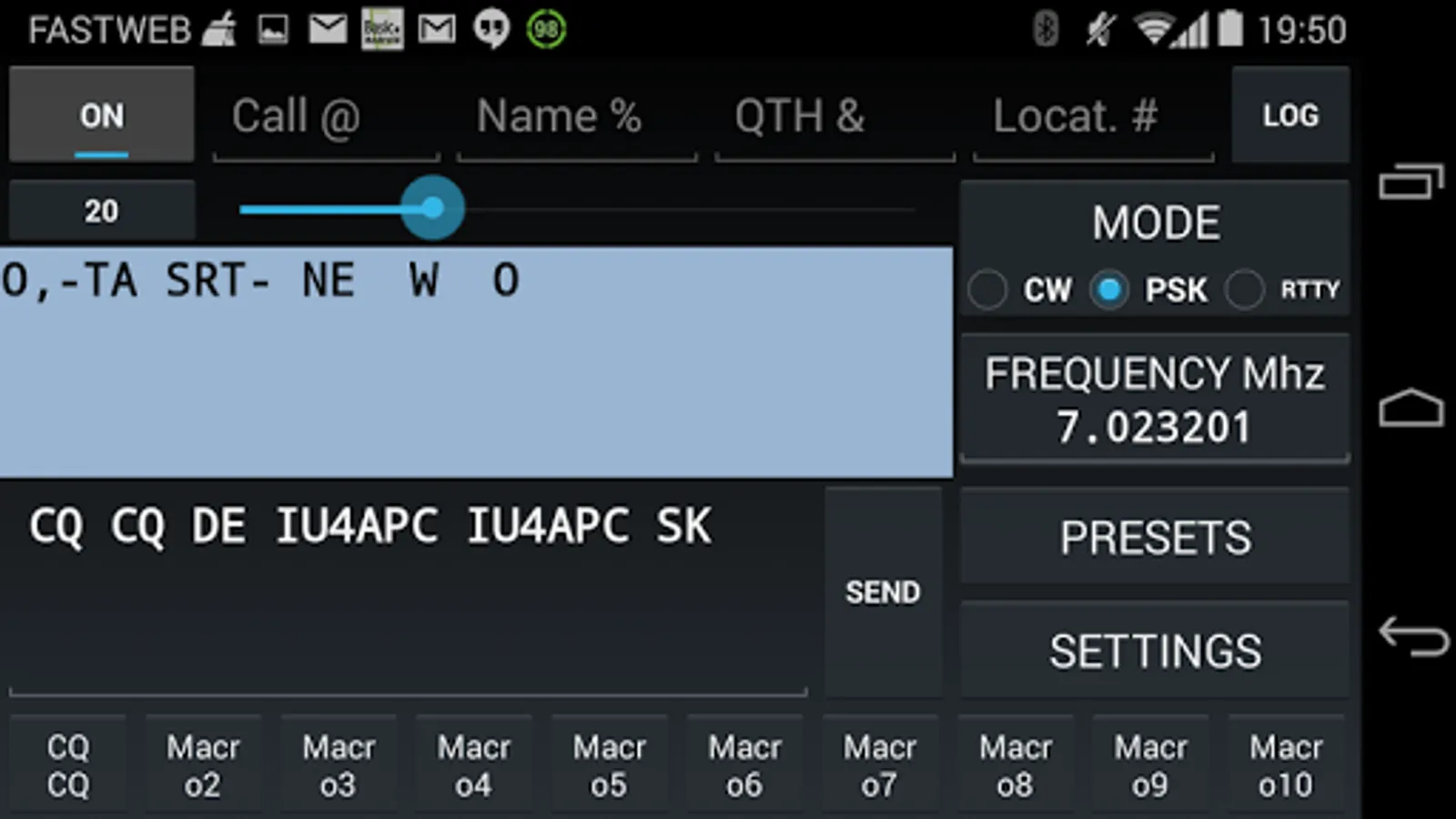 - Log your QSO in CSV and ADIF format and send them via email or to any external service supported by your mobile device (log date, time, mode, frequency, call, name, qth and locator)