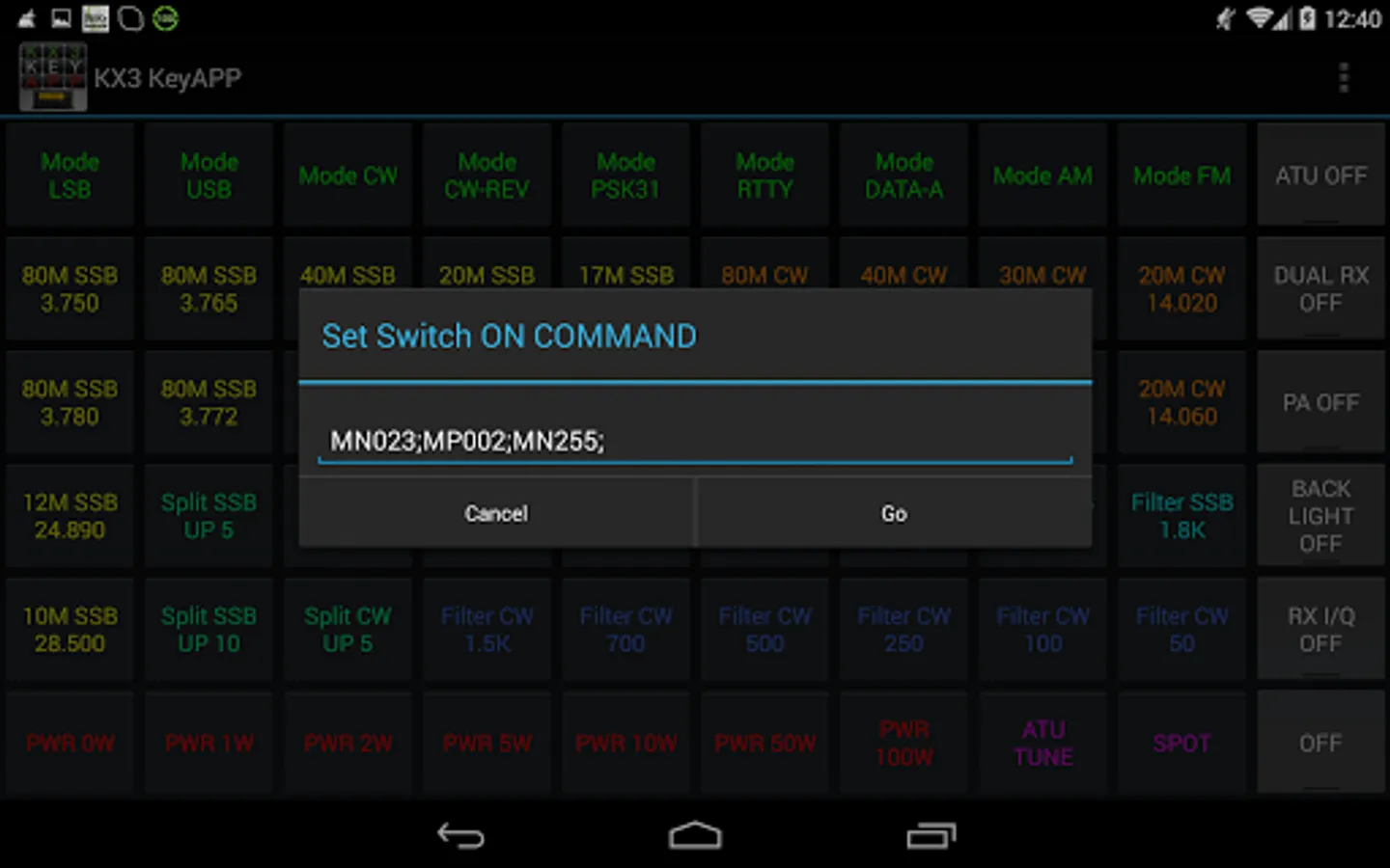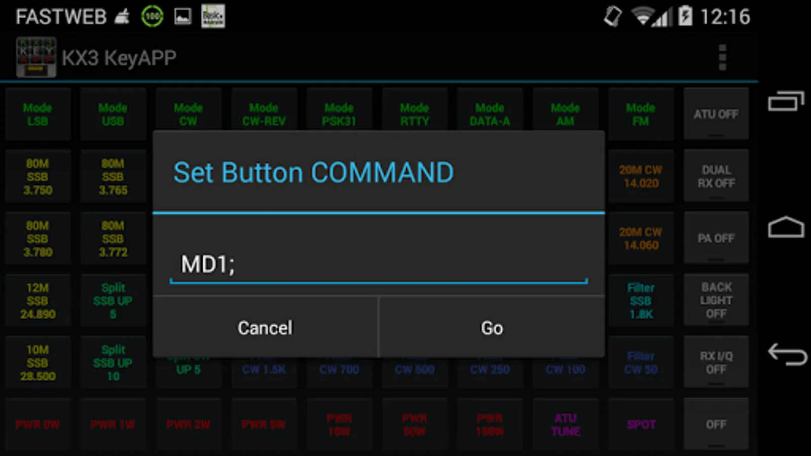 Commands have no length limit and use the Elecraft K3/KX3 programming language. The complete reference manual is referenced from inside the app for handy reference.
