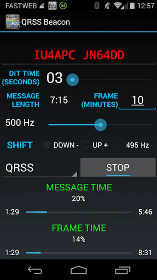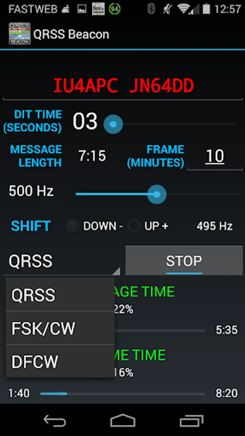 A fully featured QRSS (Slow CW) Beacon on Android. You can select a DIT duration from 1 to 60 seconds and choose one of the 3 supported modes: QRSS, FSK/CW and DFCW.