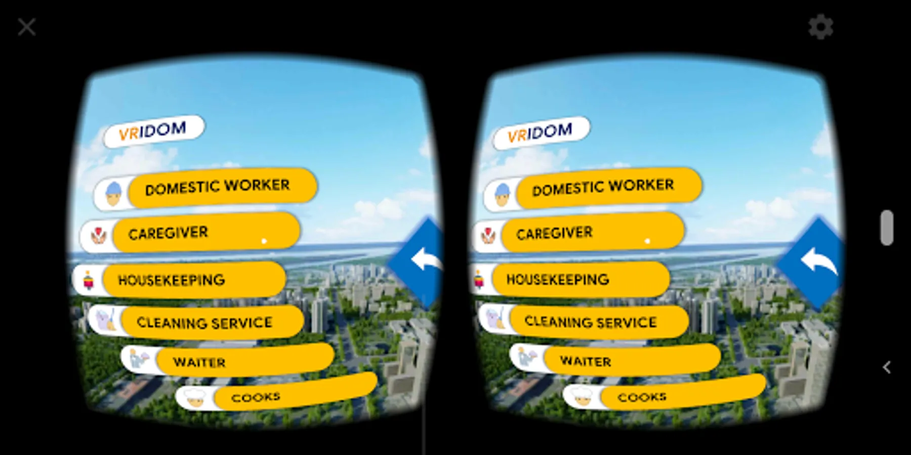 VRIDOM is a training media app based on Virtual Reality (VR) that can be either be combined with the existing conventional training to apply blended learning or be used individually. VRIDOM utilizes VR technology using smartphone and VR glass, like Google Cardboard. VRIDOM works by virtualizing the workplace environment in a destination country. The visualization is in 3D with 360-degree vision. The VRIDOM mainly consists of a variety of interactions with domestic job scenarios and Artificial Intelligence (AI).