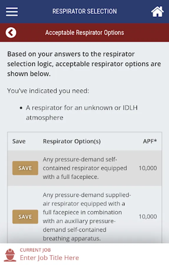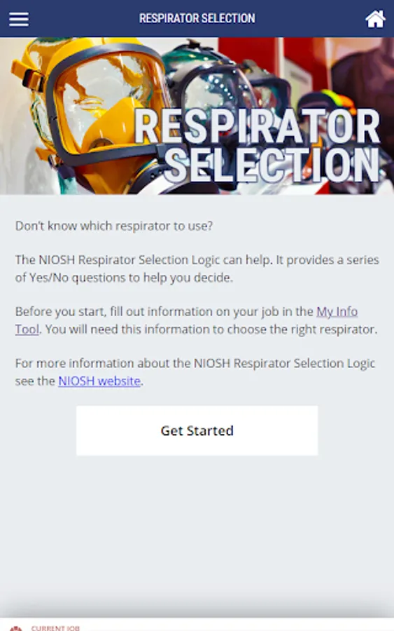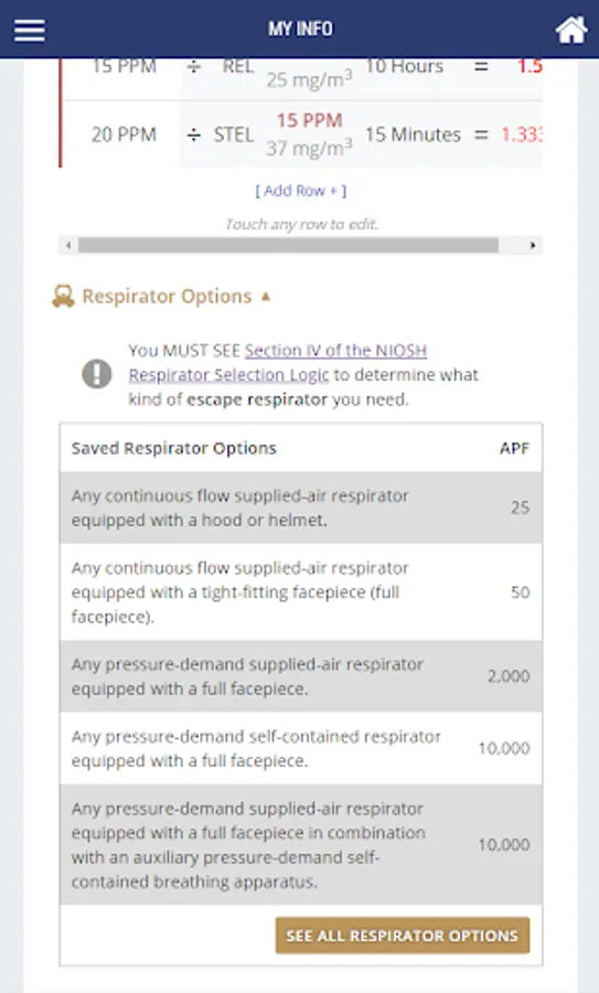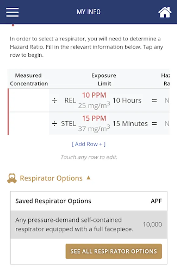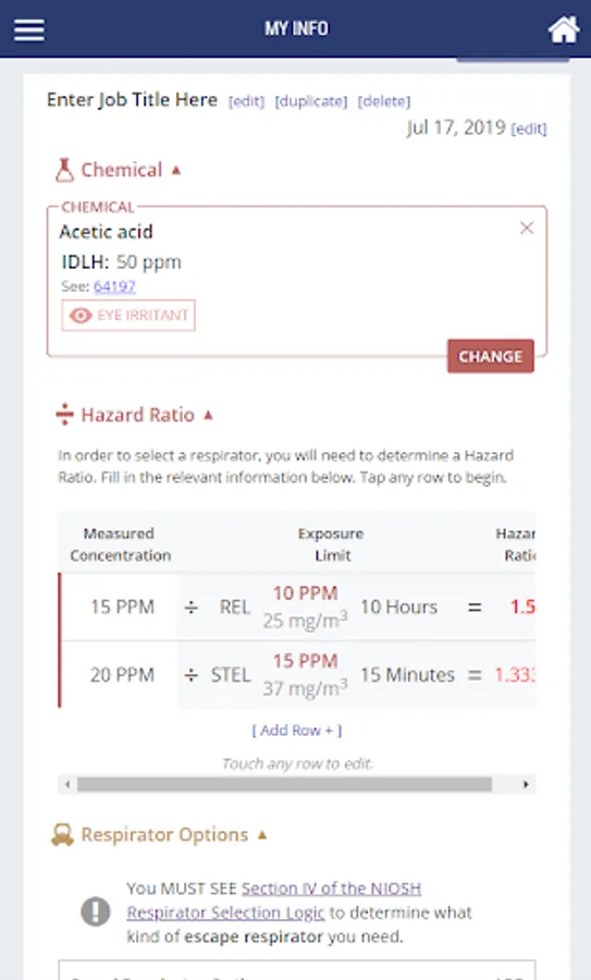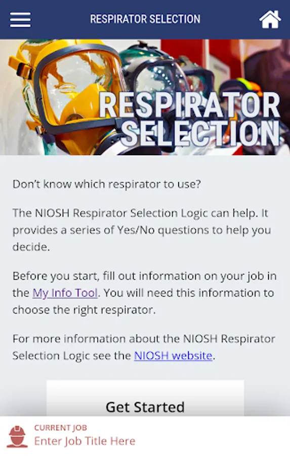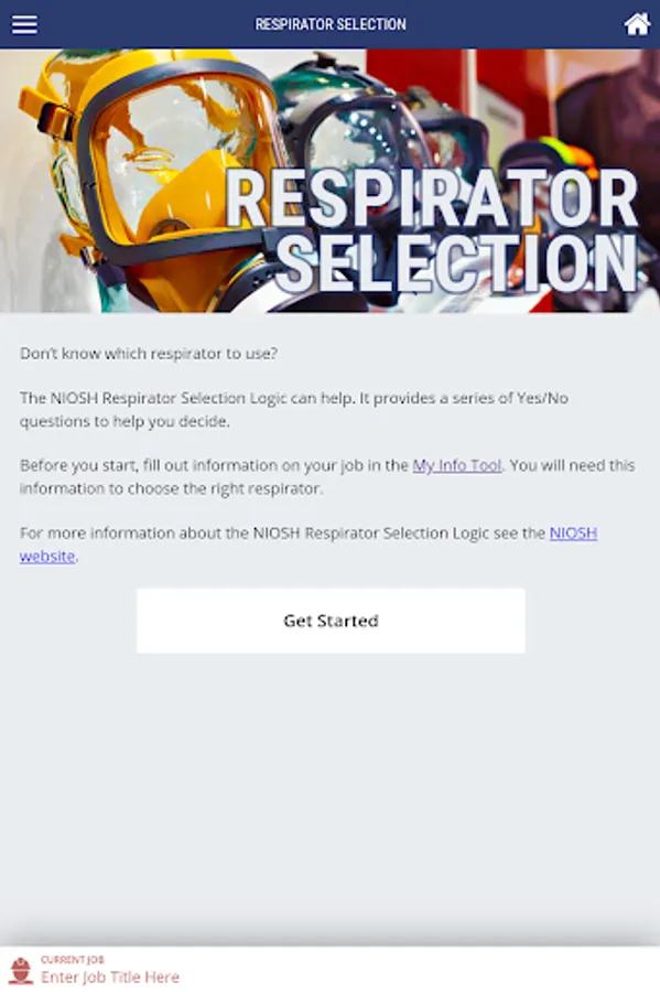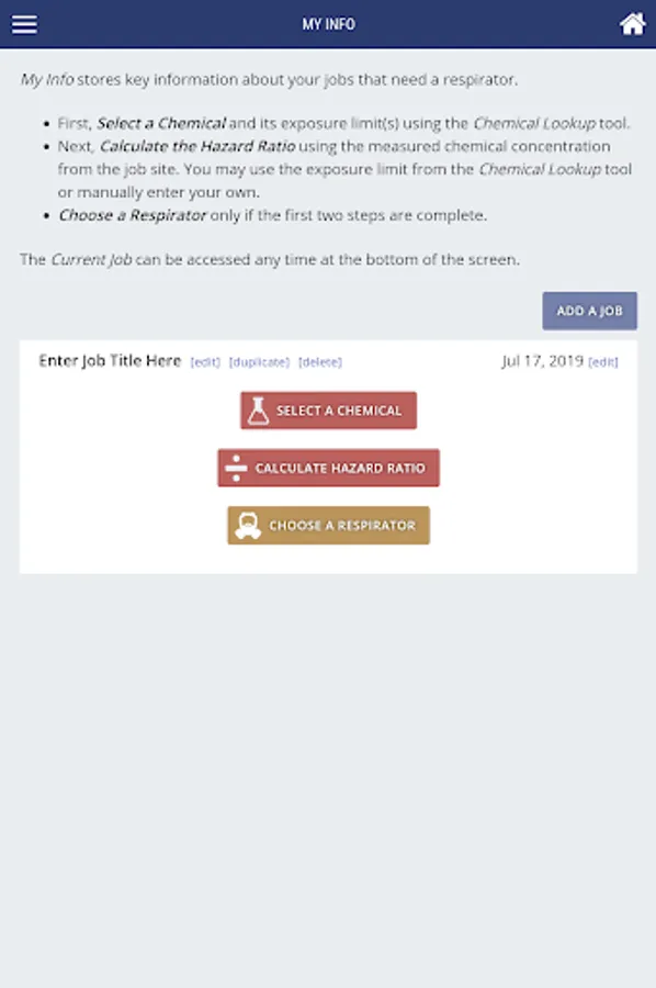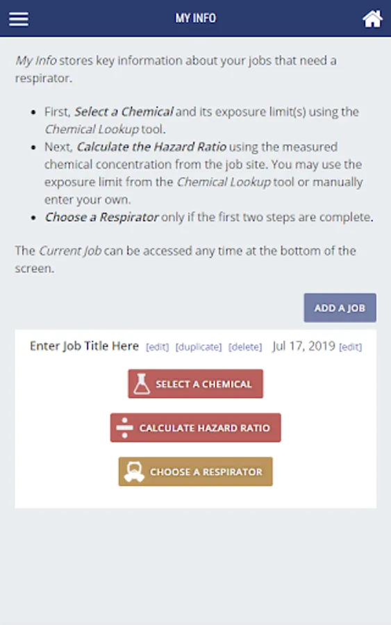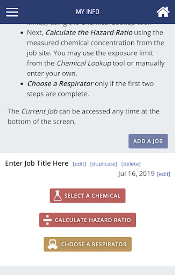 - My Info: Keep track of job details (e.g. job date, chemicals, workplace air contaminants, and respirator options).