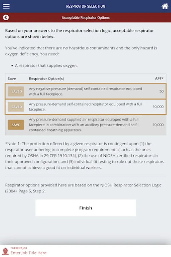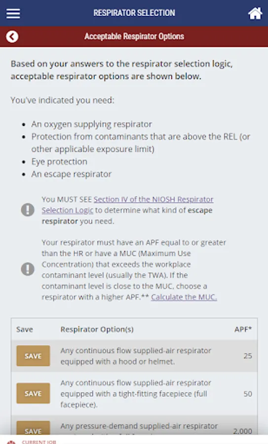 Choosing the best respirator for the job made easy! Find the chemical(s) you're working with from a list of over 700 common workplace chemicals. Save the chemical's exposure limit(s) to your job profile and record the amount of air contamination at your worksite to calculate the level of protection needed. Selecting the best respirator model is easy-- just answer a handful of Yes/No questions to get a list of acceptable respirator options. Learn about the different types of respirators, and how to conduct a fit test and user seal check. Download this app and make protecting yourself from respiratory hazards a simpler, safer process.