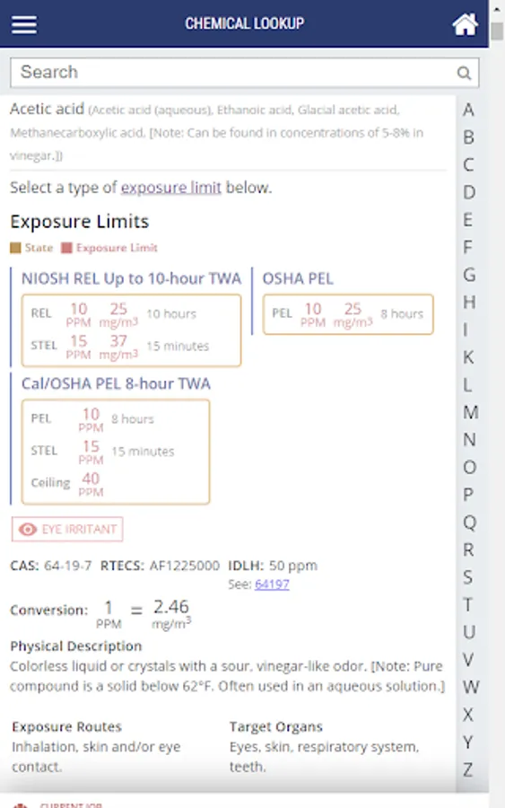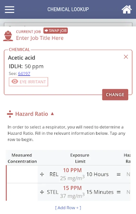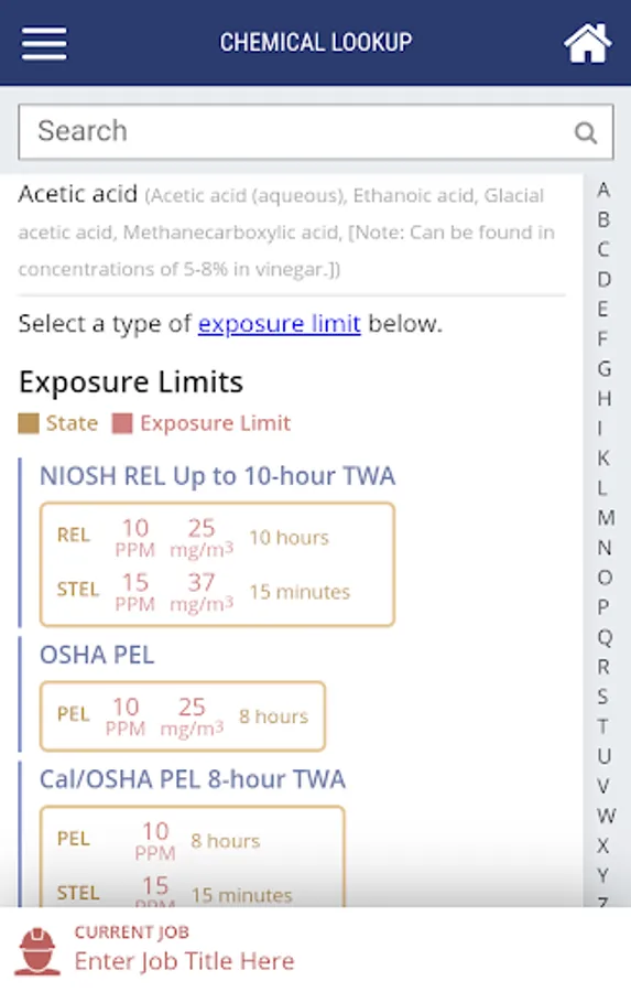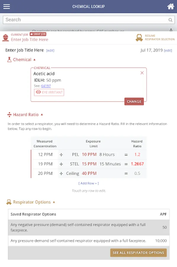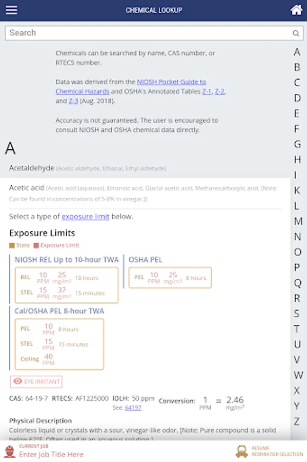 - Chemical Lookup: Over 700 chemicals, searchable by name, CAS number, or RTECS number that can be saved for each job.