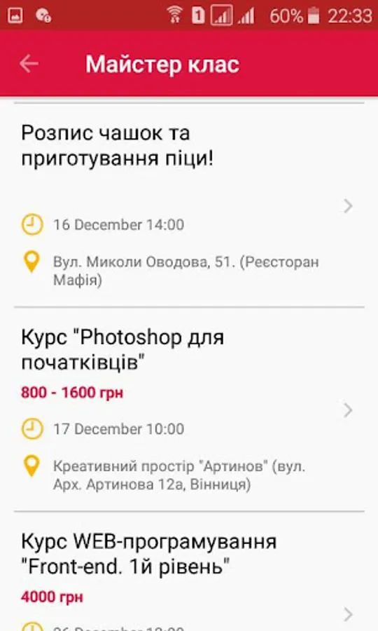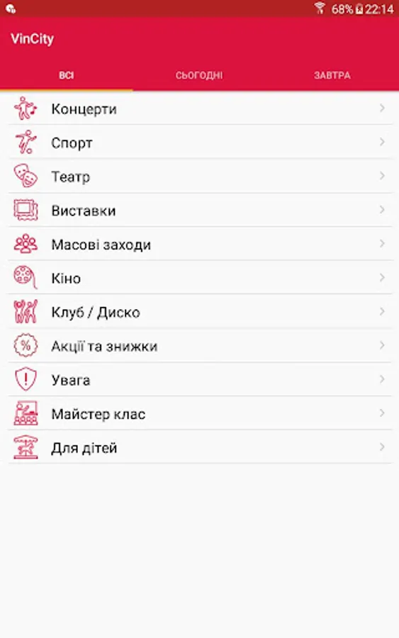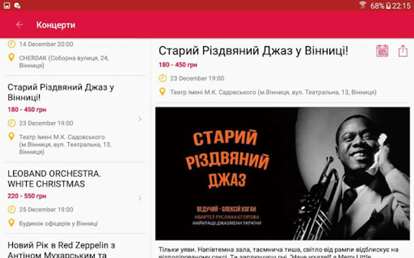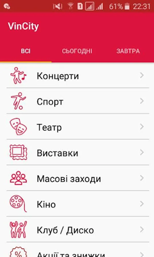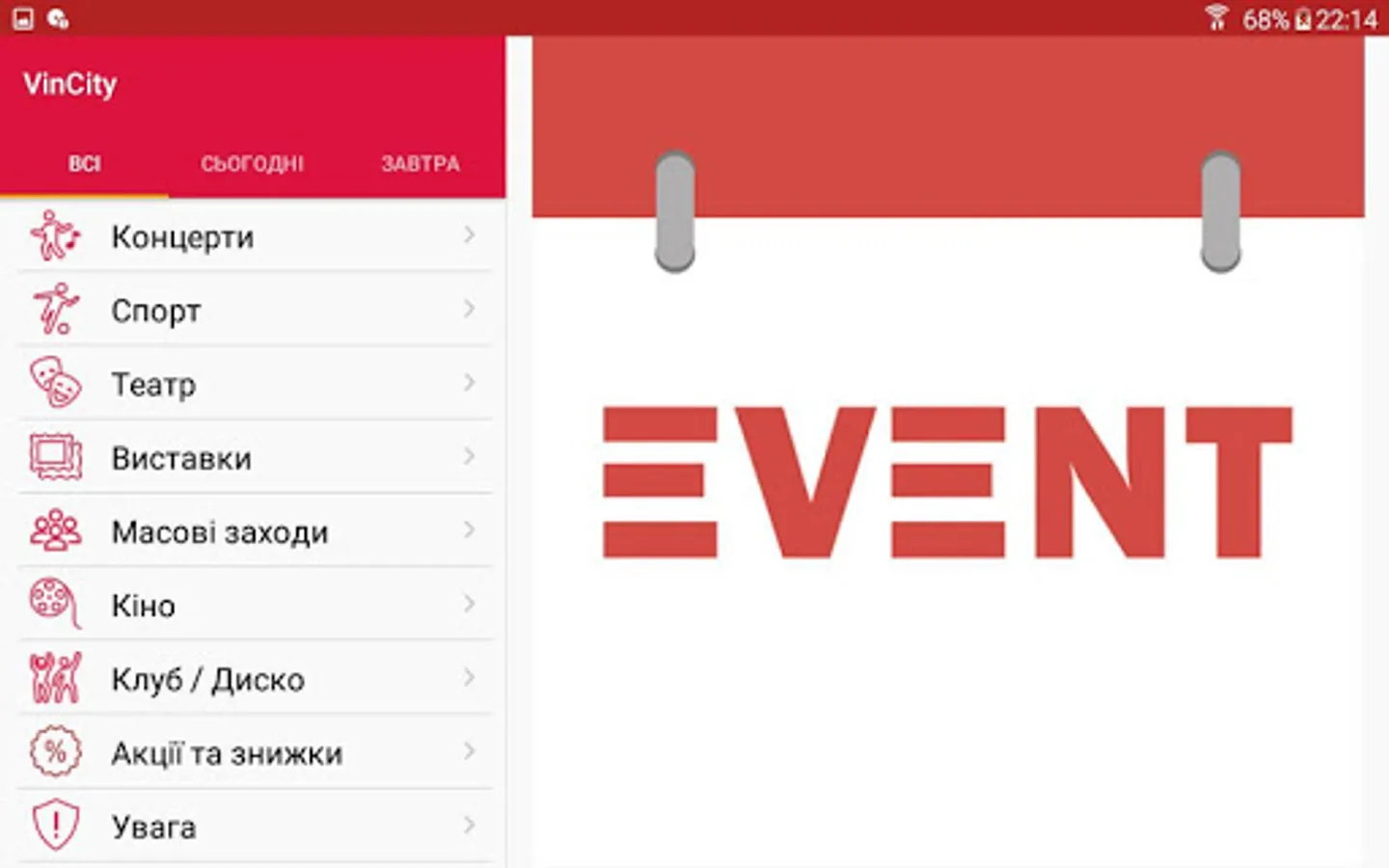Information about events in Vinnytsia. Concerts, parties, discos, theatrical performances, presentations. sports events and any other performances with the date, time of the start, the address and the cost of tickets! All this in our application.