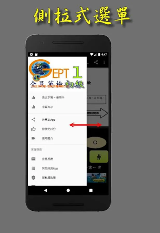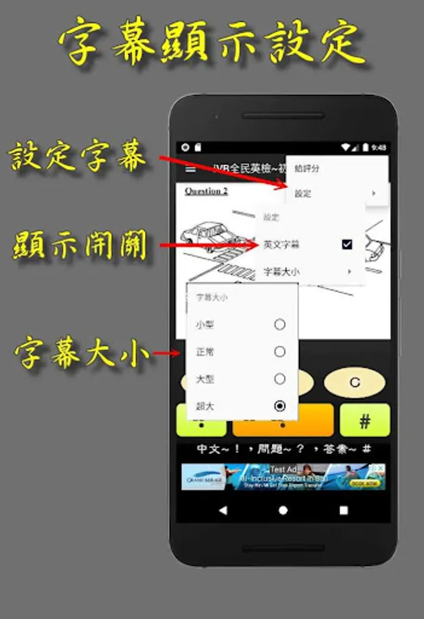 *英文字幕,當播放英文語音時可同步顯示英文字幕,增進學生對英聽的理解能力。英文字幕可自行設定是否同步顯示。字幕有4種不同大小型別可選擇。