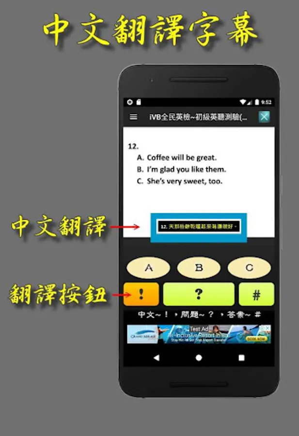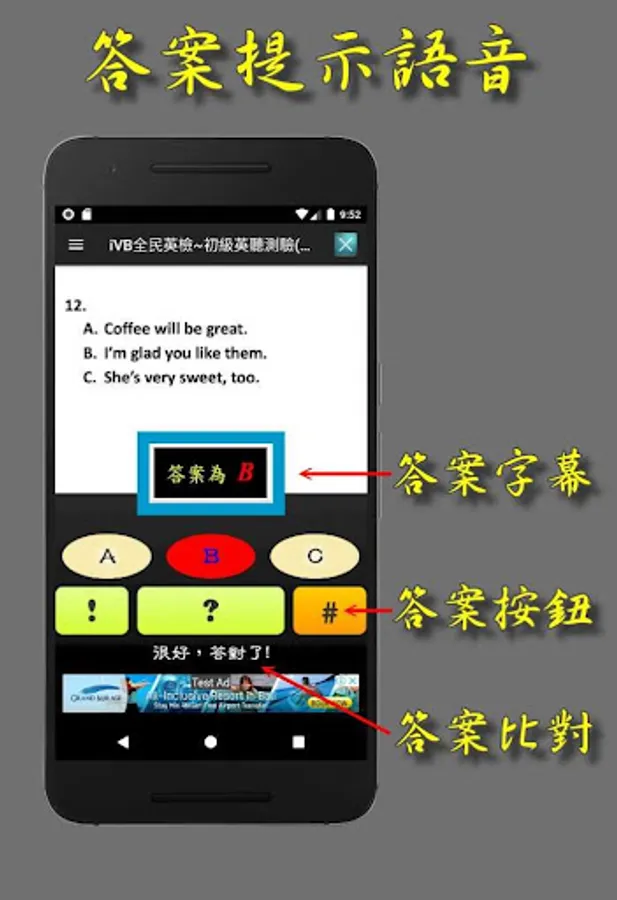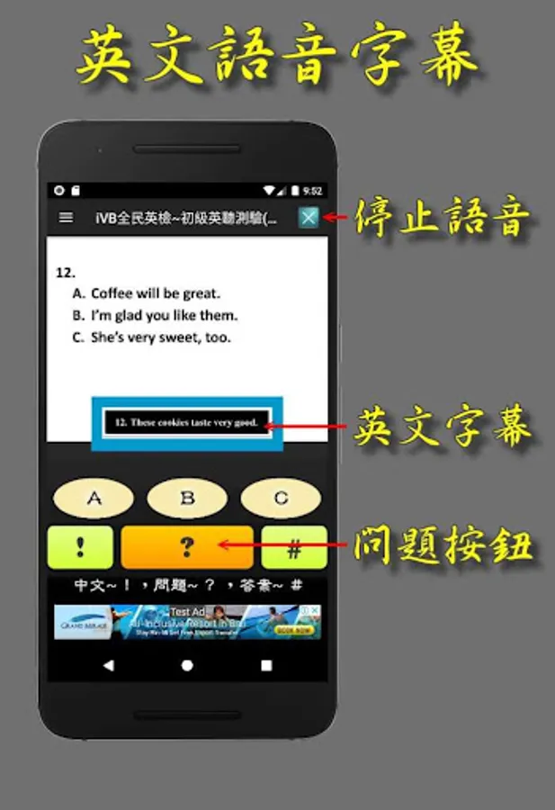 配合本演練App 做練習,讓學生藉著反覆的練習來熟悉、適應並掌握整個考試的流程和節奏。學生同時也可以逐漸熟悉習慣英文母語人士的各項說話特性。例如口音、腔調、連音、音調、句子與段落的抑揚頓挫。