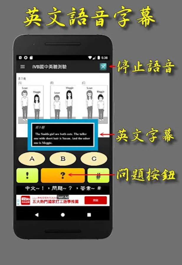“?” 符號:播放語音和顯示英文字幕。