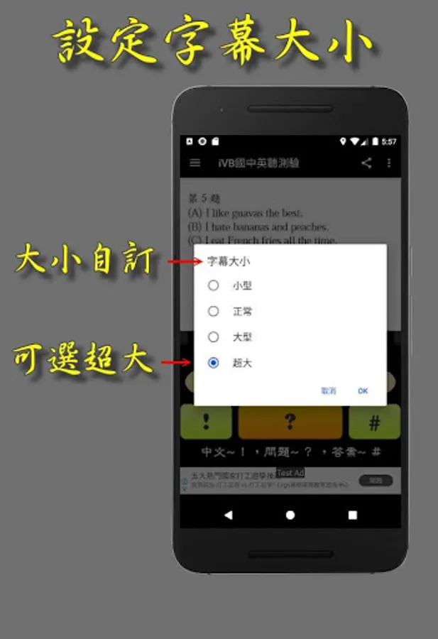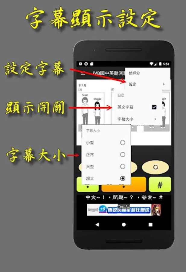 *英文字幕,當播放英文語音時可同步顯示英文字幕,增進學生對英聽的理解能力。英文字幕可自行設定是否同步顯示。