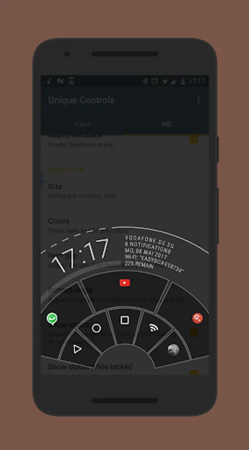 The second feature is "Pie Controls". Pie controls gives you the power of gesture navigation in whatever app you are. Simply swipe up from the bottom of the screen to reveal a beautiful menu with your favorite actions.
