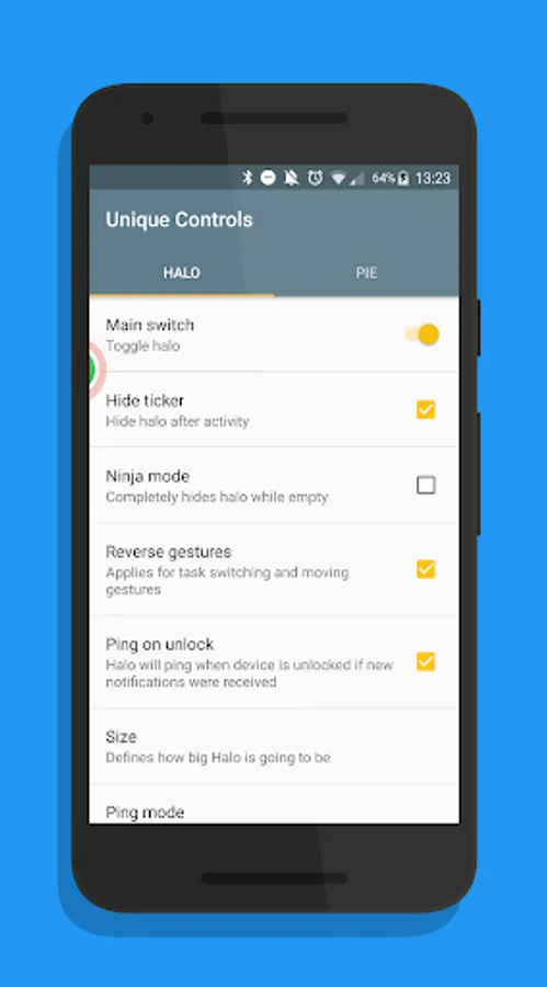 • Application blacklist to completely disable Halo and/or Pie controls in selected apps and