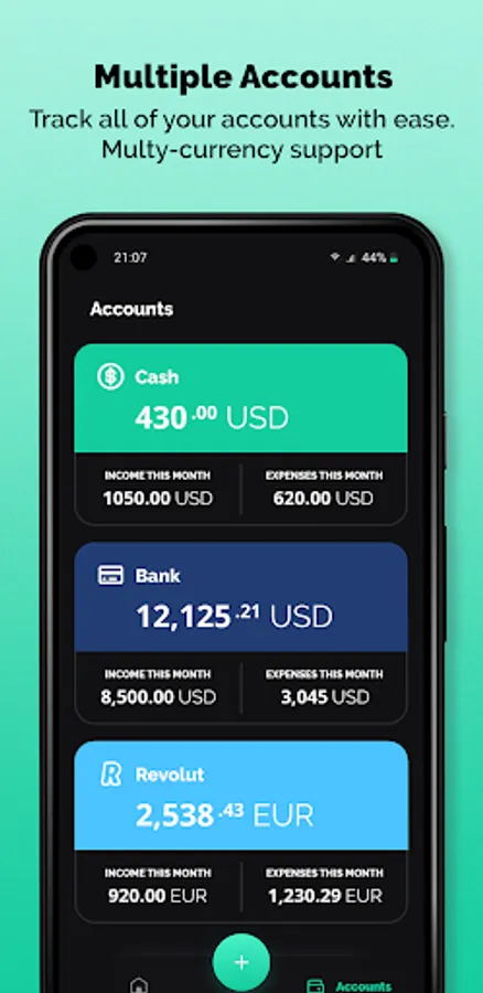 Manually track multiple bank accounts (including crypto ones) in one place. Record incomes, expenses, and transfers between them to efficiently manage your money.