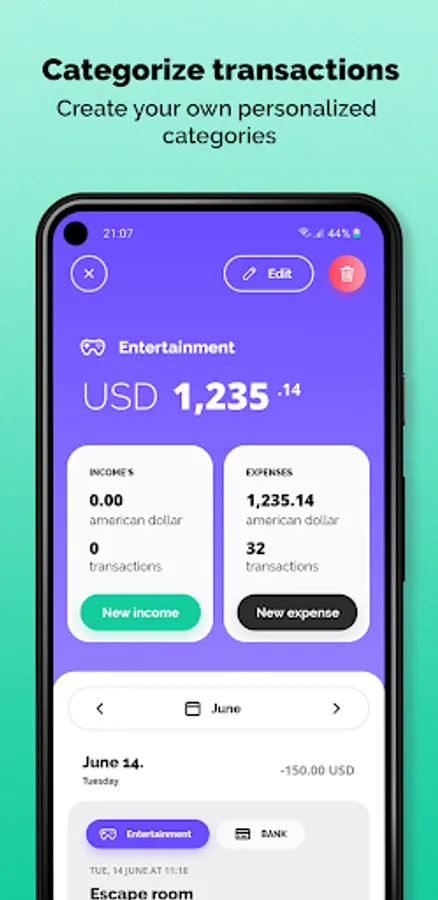 Organize your expenses in multiple personalized categories to better analyze your spending and gain personal finance insight.