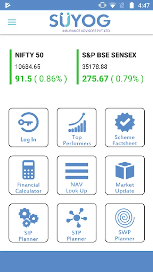 Suyog is a app for Investors to track their Investment Portfolio. Products covered include Mutual Funds & Equity Shares. Details of Insurance, FD's and Other asset classes will also be available shortly.