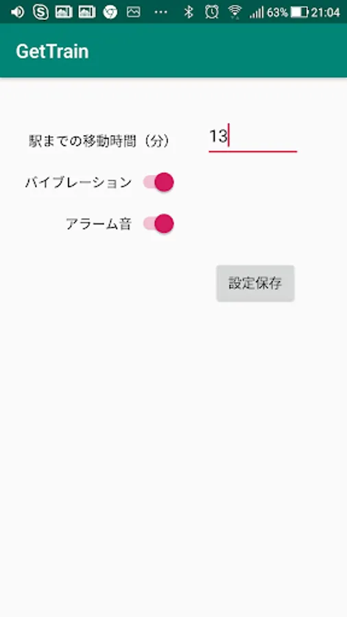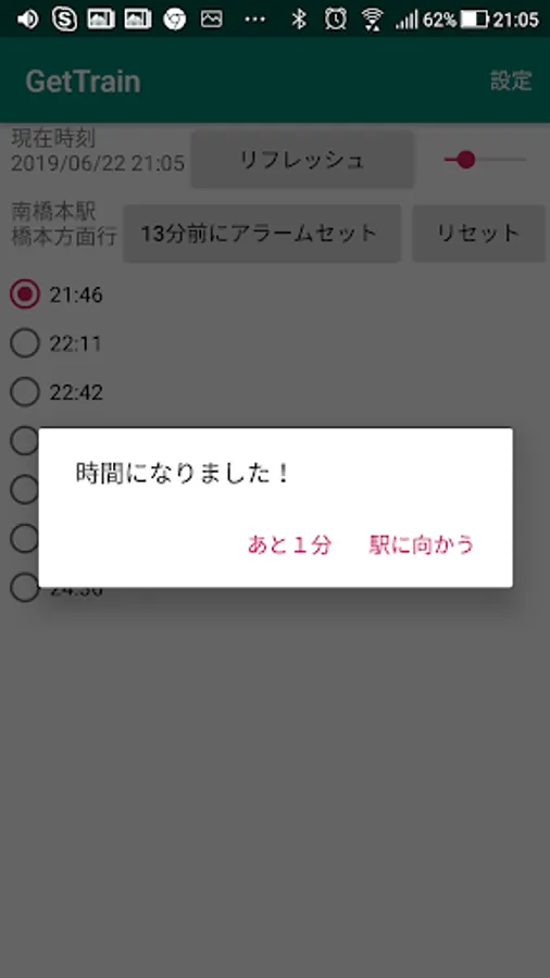 Set the alarm to be in time for the train departure time. JR Minami-Hashimoto Station Hashimoto-Hachioji area departure time (weekday) corresponds. From the setting menu, you can specify the default time required for the station and the alarm type (vibration or alarm sound or both).