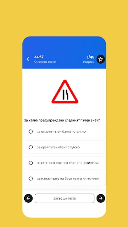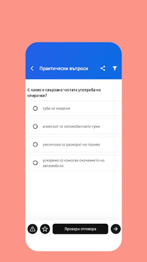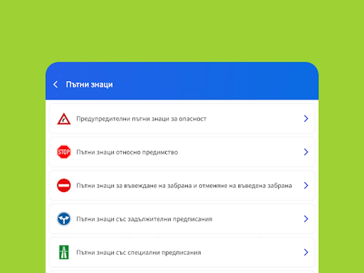 We present you an application for preparation for the driving test, meeting the requirements set by the Traffic Police and the State Automobile Inspectorate for 2022. Our information is constantly updated in accordance with the new changes in the Bulgarian legislation. We provide you with an easy, convenient and fun way to successfully prepare for your driving test without much effort.