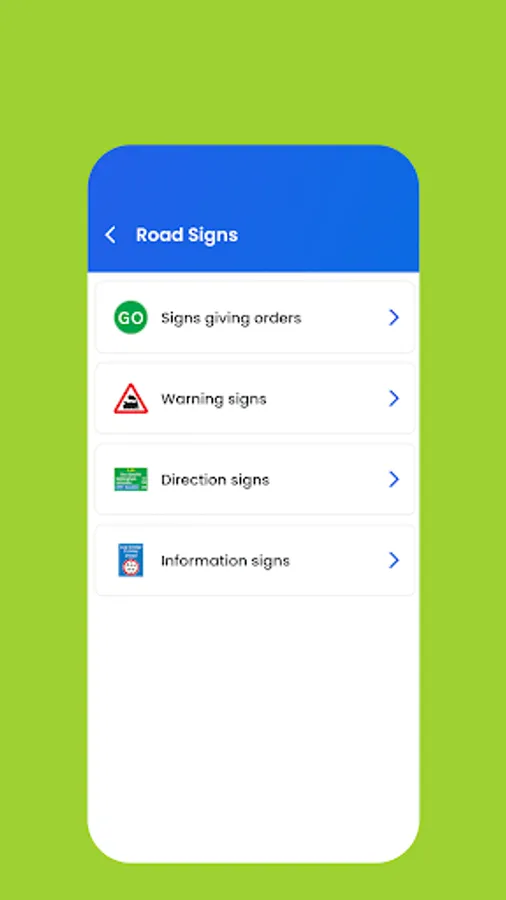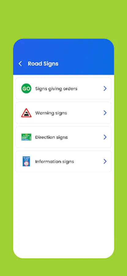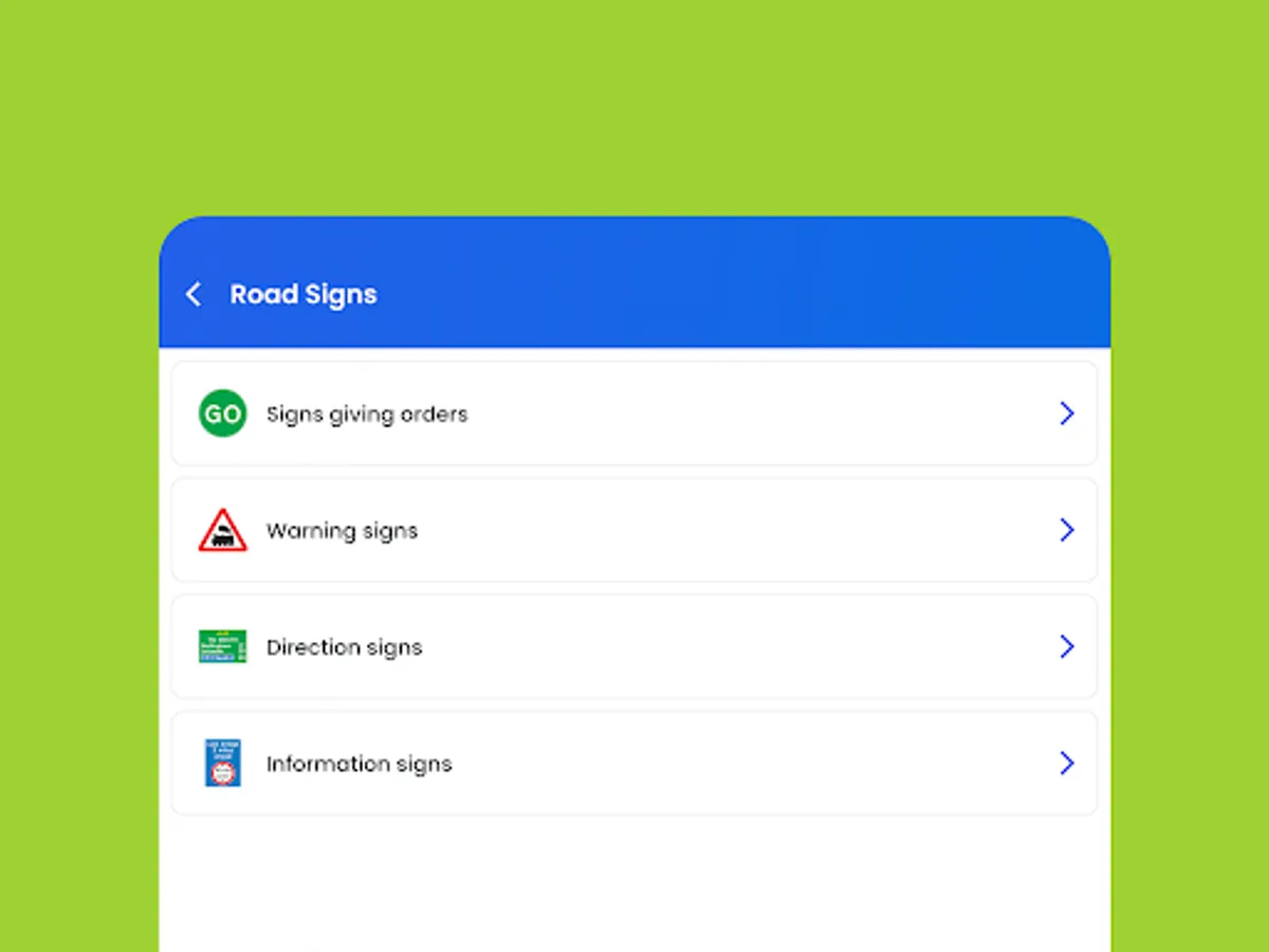 3. Road Signs – a full list of all relevant road signs, by categories.