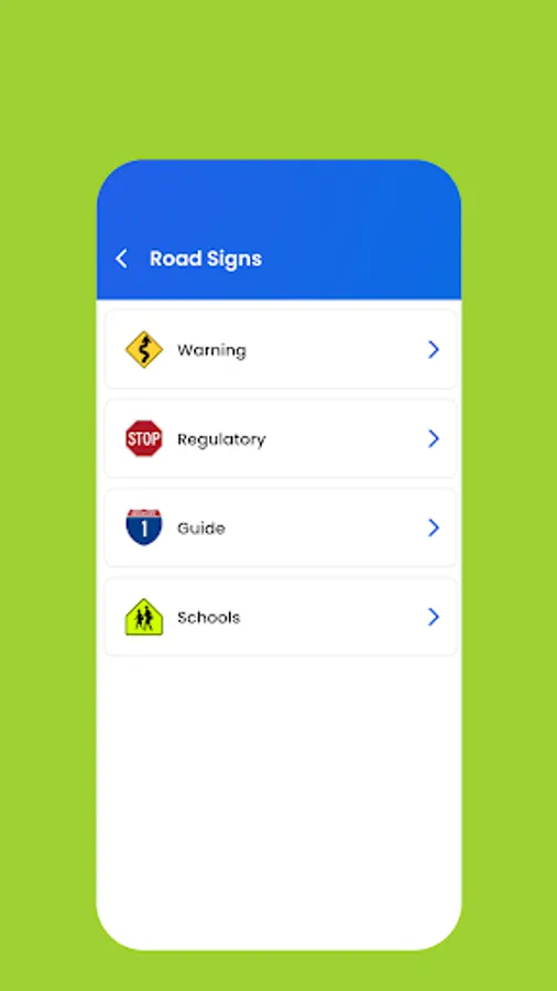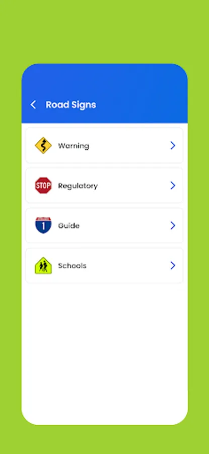 3. Road Signs – a full list of all relevant road signs, by categories.